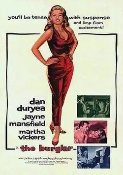 The Burglar is a 1957 American crime thriller film noir released by Columbia Pictures, based on the 1953 novel of the same name by David Goodis (who also wrote the script). The picture stars Dan Duryea in the title role and Jayne Mansfield. The movie was the first feature film directed by Paul Wendkos.[1] John Facenda, a well-known Philadelphia sportscaster, is featured as a news anchor in one scene. Much of the film was shot on location in Philadelphia and Atlantic City.[2]