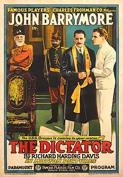 The Dictator is a 1915 American silent comedy film directed by Oscar Eagle and reputedly Edwin S. Porter. It was based on a play The Dictator by Richard Harding Davis and produced by Adolph Zukor (Famous Players Film Company) and the Charles Frohman Company. John Barrymore stars in a role played on the stage by William Collier Sr. whose company Barrymore had performed in this play. The film was rereleased on April 13, 1919 as part of the Paramount "Success Series" of their early screen successes. The story was refilmed in 1922 as The Dictator starring Wallace Reid. Today both films are lost.[1][2][3][4]