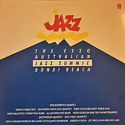 The Esso Australian Jazz Summit was held on Saturday 22 February 1986 at Sydney's Bondi Beach. The Summit had 13 acts set to play but the show wash rained out after only 10 had performed.[1] Don Burrows Quintet, Andrew Firth with the Don Burrows Quintet, Sandy Evans Trio, Southern Cross Jazz Quartet, Andy Sugg and Andy Vance Duo, Dave Dallwitz Sydney Big Band, Allan Browne Band, Merve Acheson and the Mainstreamers, Jazzmanian Quartet, Rick Price Quartet and NSW Conservatorium Big Band all performed. Nova Dreams, Schmoe and Co and the Bernie McGann Quartet were listed did not get to play.[2]