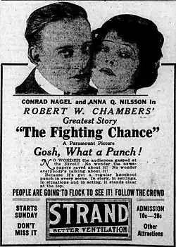 The Fighting Chance is a surviving[1] 1920 American silent drama film directed by Charles Maigne and written by Will M. Ritchey. It was formerly thought to be lost. The film stars include Anna Q. Nilsson, Conrad Nagel, Clarence Burton, Dorothy Davenport, Herbert Prior, and Ruth Helms. It is based on the 1906 novel The Fighting Chance by Robert W. Chambers. The film was released on August 1, 1920, by Paramount Pictures.[2][3]