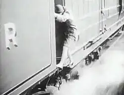 Pauline Johnson walks along the edge of the locomotive, a genuine stunt in the climax of the film.