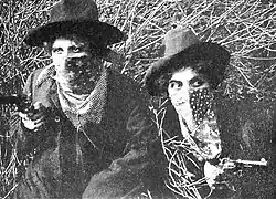 The Girl Bandits' Hoodoo was among the early "photoplays" produced by Kalem at the second studio or "company" it established in California, the one that began operations in Santa Monica in 1911.[4] The other West Coast site, in Glendale, had been set up the previous year.[e] Each Kalem location was administered as a single, self-contained production company, much like in repertory theatre, with each unit composed of a director, a select group of actors or "principal artists", and a small production crew.[5] The personnel in Santa Monica, as in Glendale, all worked as a team, performing together repeatedly, producing one film project after another.[6] The Girl Bandits' Hoodoo, in keeping with the vast majority of Kalem's releases in the early 1910s, was a one-reeler with a final running length of approximately 1000 feet, and it was filmed in one week or less.[7] Pat C. Hartigan in 1912 was in charge of directing all the productions for the Santa Monica company, which quickly became a unit that specialized in comedies and Westerns. The Girl Bandits' Hoodoo therefore proved to be an ideal blending of both types of motion pictures.[6][f]