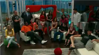 On Day 1, contestants moved into The Glass House. Holly and Robin were placed in the "enemies" room, while Erica and Andrea were placed in the "friends" room.[38] On Day 2, during the first live-feed showing, contestants played a game in which they had to guess the answer to questions that the public were answering live. The questions were multiple choice, and varied from topics such as whether it is acceptable to have sex on the first date to what is the rudest thing a person could do during a first date. Other questions involved the contestants reactions to learning their child was gay, and how long should a couple date before marrying. To answer the questions, contestants had to go to either the "friends room", "enemies room", the bathroom, or the kitchen counter, with each room symbolizing a specific answer. The contestants were later asked to tell who they felt their biggest threat was, with Andrea and Kevin receiving the most votes from their fellow contestants. They later split into teams to compete in the first competition. The competition, titled "Twist and Shout", featured the contestants solving a puzzle built onto the wall based on information about their fellow contestants.[39] The contestants split into east vs. west to do the challenge, with the east team winning. Jacob was the captain of the west team, and therefore became the first contestant to be sent to limbo. The contestants had to choose whom to send to limbo with him later on.