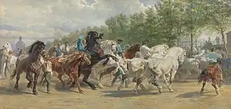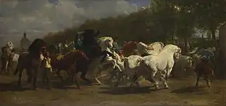 The Horse Fair is an oil-on-canvas painting by French artist Rosa Bonheur, begun in 1852 and first exhibited at the Paris Salon in 1853. Bonheur added some finishing touches in 1855. The large work measures 96.25 in × 199.5 in (244.5 cm × 506.7 cm).[1]