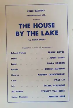 The House by the Lake is a 1956 British stage thriller in three acts, by Hugh Mills.[1] The main characters are Maurice and Stella, a brother and sister who plot to murder their unlikeable brother, Colin.[2] The other characters include Maurice's wife, Janet, Colin's long-suffering wife, Iris, and Colonel Forbes, a neighbour.[3]