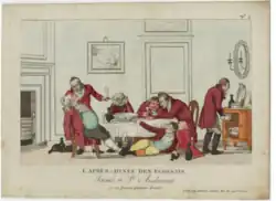 The etymology of the Club’s name remains unclear. There are three theories as to its origin: 1. It is a corruption or anglicisation of the Scots name of the town of ‘Kennoway’/‘Kennoton’, a town in Fife less than two miles from Castle Balgonie; 2. It is a corruption or anglicisation of the old Scots term ‘keest-an-ton’ meaning ‘a vigorous shout or hunting cry’; and 3. There is some suggestion in the Club’s own history that ‘Kensington’ may have been the name of a mutually funded race horse owned by the club at some point in its early history.The evidence for the continued activities of the club are unsurprisingly scanty in the historical record. A print collection of 1814, by an anonymous Frenchman, contains a plate which is generally supposed to show the Kensington Club at dinner, entitled “L’Après Dinée des Écossais - Scenes á St Andrewes”. The engraving depicts seven men in matching maroon tailcoats in the later throws of a drunken dinner party (maroon and green being the club colours).