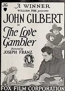 The Love Gambler is a 1922 American silent Western film directed by Joseph Franz and written by Jules Furthman. The film stars John Gilbert, Carmel Myers, Bruce Gordon, C.E. Anderson, W. E. Lawrence and James Gordon. The film was released on November 12, 1922, by Fox Film Corporation.[1][2][3]