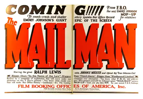 59. ^ a b c d "New F.B.O. Film Opens in Two Cities". Exhibitors Herald. Chicago, Exhibitors Herald. November 10, 1923. p. 677. Archived from the original on March 24, 2014. Retrieved May 8, 2023. Emory Johnson's "The Mailman" Has Premiere at Washington and Philadelphia