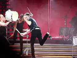 Warren Carlyle was signed as the creative director for the show, while Ashley Wallen choreographed the dancers through intricate dance steps.[20] The large main stage was elevated and set up at the end of the arenas, with a long runway extending from its middle, the pathway ended into a round-shaped front.[21] The tour featured costumes from Tom Ford including, a black snake-print velvet jacket, a metallic silver jacket and an ensemble of white shirt with pleated bib, silk-satin cummerbund and black fedora.[22][23][24][25][26]