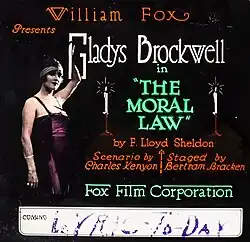 The Moral Law is a 1918 American silent drama film directed by Bertram Bracken and starring Gladys Brockwell in a dual role, Rosita Marstini, and Joseph Singleton. The story was written by E. Lloyd Sheldon. The film was released by Fox Film Corporation on February 17, 1918, as a Fox Special Features release.[1][2]