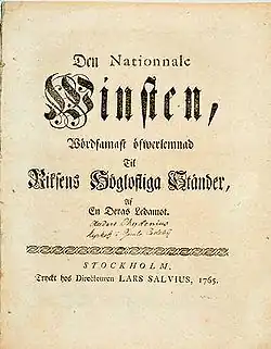 The National Gain (Swedish title: Den Nationnale Winsten) is the main work of the Swedish-Finnish scientist, philosopher and politician Anders Chydenius, published in 1765. In this thesis Chydenius argues in favour of free export trade rights for the province of Ostrobothnia and lays down the principles of liberalism and the free markets – for example, free trade and industry – eleven years before Adam Smith in The Wealth of Nations (1776).[1][2] The book also includes a description of what Smith later dubbed the "invisible hand". In the book, Chydenius attacks the export subsidy as an example of the harmful effects of government intervention on the domestic economy.