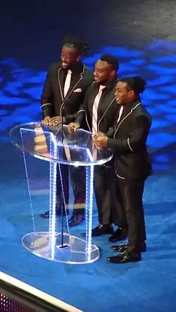 The early months of the stable as stereotypical black gospel babyface characters were marked by largely negative reactions from fans and critics alike, but after transitioning their characters into heels fanatically obsessed with the nostalgia-style "power of positivity" in April 2015, they began to receive acclaim for their entertainment value, as well as for their in-ring performances.[1][2][3][4] In 2015, the trio were collectively named "WWE Wrestler of the Year" by Rolling Stone, while also being recognized as the "Best Gimmick" of the year by the Wrestling Observer Newsletter.[5][6] Additionally, they became the first trio to win the Pro Wrestling Illustrated award for "Tag Team of the Year", doing so in 2015 and 2016 (the first two wins in a row in this category for two decades). Their new-found popularity resulted in the trio reverting to babyfaces in early 2016, which they remained as until December 2024, when Kingston and Woods reverted back to being heels after Big E’s firing from the group. The three, who are close friends in real life, also appear or work together outside of wrestling, notably writing the 2016 book The Book of Booty: Shake It. Love It. Never Be It, and hosting a weekly podcast, Feel the Power (named after one of their catchphrases), since 2019. In 2021, The New Day topped WWE's list of the "50 Greatest Tag Teams" in the promotion's history.[7]