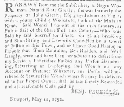 - ^ "RUNAWAY". The Newport Mercury. May 12, 1792.