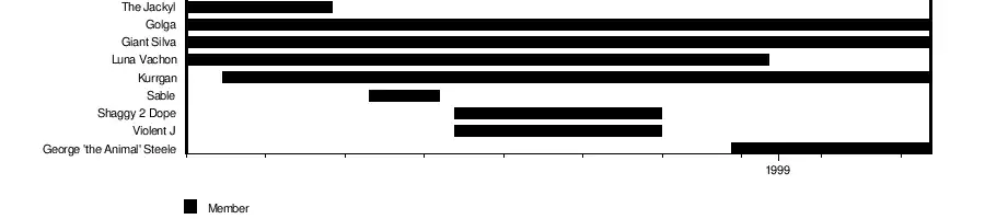 They later started a feud with The Headbangers (Mosh and Thrasher), who feigned friendship to attack the group on Raw in September 21, 1998. The Oddities scored victories against them in Raw and Sunday Night Heat thanks to interventions by Insane Clown Posse, which caused The Headbangers to start targeting them specifically. They challenged ICP to a tag team match on October 5 on Raw, during which Insane Clown Posse were beaten down.[5] At Judgment Day: In Your House's Heat tapings on October 18, the Oddities defeated Los Boricuas (Jose Estrada, Miguel Pérez Jr. and Jesús Castillo), but The Headbangers intervened and attacked ICP after the bout. This and similar incidents frustrated the duo, who started blaming the Oddities for their beatdowns. Violent J and Shaggy worked to become active wrestlers in the group, but they also demonstrated too much aggression, causing the disqualification of the group in a rematch against Kai En Tai on October 20 on Raw when they attacked the referee. Finally, on the November 23 episode of Monday Night Raw, the Insane Clown Posse turned on the Oddities and joined The Headbangers to assault and humiliate their former stable with Mace. The following week, the remaining Oddities returned the attack and challenged Mosh and Thrasher to a match in Rock Bottom: In Your House, but they were defeated. The group then enlisted the aid of George "The Animal" Steele, who was introduced in a giant gift box to attack the Headbangers by surprise. He was referred by the announcers as the "original Oddity" .[2] The same month, however, Vachon became a villainess aligning herself with Shane McMahon and abandoned the group to feud over the WWF Women's Championship with Sable.