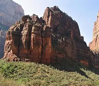 The Organ is a 5,080-foot (1,550 m) elevation Navajo Sandstone summit located in Zion National Park, in Washington County of southwest Utah, United States.[2] The Organ is situated in the Big Bend at the north end of Zion Canyon, rising 700 feet (210 meters) above the canyon floor and the North Fork of the Virgin River which drains precipitation runoff from this rock. Neighbors include The Great White Throne, Cathedral Mountain, Angels Landing, Observation Point, and Cable Mountain. The Organ is believed to have been named by Claud Hirschi and Ethelbert Bingham, residents of Rockville, on their 1916 trip with Methodist Minister Frederick Vining Fisher, who also named geographical formations in Zion.[3] This geographical feature's descriptive name was officially adopted in 1934 by the U.S. Board on Geographic Names.[2]