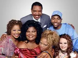 The cast of The Parkers on The Mo'Nique Show: (l-r) Ken Lawson, Dorien Wilson (back row), Jenna von Oÿ, Mo'Nique and Countess Vaughn (front row)