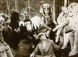 The Ringtailed Rhinoceros (also cited The Ring-Tailed Rhinoceros) is a lost 1915 American silent comedy-drama film that depicted the ruinous effects of alcohol on a good-natured man and on the lives of the people around him.[2][3] Like snakes and "pink elephants" that have been used in many societies to symbolize heavy drinking or been associated with the hallucinations of drunkards, the main character in this "'photophantasy'" blamed instead a "Ringtailed Rhinoceros" for his excessive use of wine and liquor.[b][4]