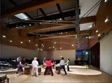 Named for donors Michael and Sonja Koerner, Koerner Hall opened in September 2009 and houses 1,135 seats. It was designed by KPMB Architects, under the direction of Marianne McKenna, theatre consultant Anne Minors Performance Consultants, and acoustics company Sound Space Design. It features two balcony tiers above the main orchestra level as well as a third technical balcony.[47] Koerner Hall's signature element is an acoustically transparent veil of twisting oak strings that forms the backdrop for the chorus at the first balcony level, then hovers over the stage below the fixed acoustic canopy, extending into and over the hall at the technical balcony level.[48] Completion of the project also includes three tiers of glass fronted lobbies overlooking Philosopher's Walk, back-of-house areas for performers, a ground-floor café, and installation of a unique collection of antique musical instruments donated by the Koerner family and valued at $1 million.[49] Each level is also equipped to host a variety of private functions.