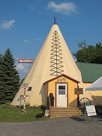 The Tepee is a historic commercial building and roadside attraction located near Cherry Valley in Otsego County, New York, United States. It was built in 1954, and is a wood-frame structure sheathed in galvanized steel on a concrete foundation. It measures 50 feet tall and 42 feet in diameter. It has four levels. Attached to the tepee is an L-shaped wood-frame building with a cross-gable roof. The building houses a gift shop and food stand.[2]: 3–4