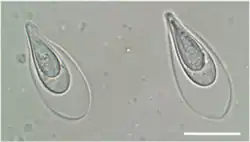 | Fresh myxospores of T. kitauei from a skin smear of common carp; from Zhai et al. 2016; size bar 10 μm. | |