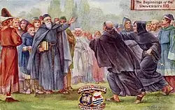 Theobald's arrival at Oxford, opposed by a pair of monks from Abingdon.