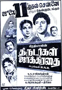 Thirudargal Jakkirathai (transl. Beware of Thieves) is a 1958 Indian Tamil-language film directed by B. Narasimha Rao.[2] The film stars S. S. Rajendran and G. Varalakshmi. It was simultaneously produced in Telugu with the title Dongalunnaru Jagratha. The film was released on 11 July 1958.[3]