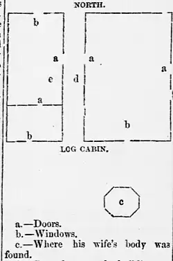 In January 1877, Williamson married 57-year-old Susan Kerk in Centralia, Missouri.[3] The couple were happy together, but their poverty forced them to travel around Missouri, selling wares to whoever might be interested. The following year, they came across a Dr. Middleton, who directed them to go to Sedalia, where the local mayor, Col. Crawford, would likely find suitable work for them.[5] By the fall of 1889, the couple were living in a log cabin six miles outside Sedalia, but they abandoned it some time in September or October. Williamson moved to the city and worked various odd jobs, but strangely, his wife was nowhere to be found. When queried about her whereabouts, Thomas replied that she had gone to visit some relatives in Calhoun, Illinois, and would return shortly.[5] When she didn't, Williamson claimed that she had died from renal colic while in Illinois, and being too poor to have her remains transported, he would have her buried there. Although some were suspicious of his claims, nobody looked further into the incident and it was soon forgotten.[5] The only one to take notice was farmer Dan Clossier, the new owner of the log cabin, who was informed by Williamson not to dig out a certain location on the premises, claiming that "he had planted parsnip there".[6] At some point, Williamson became a member of the local Salvation Army branch, where he was sheltered.[7] As he was jobless at the time, he sought out work around the town, and would eventually find employment as a farmhand on the Moore farm, which was run by 59-year-old Jefferson "Jeff" Moore and his 29-year-old son, Charles.