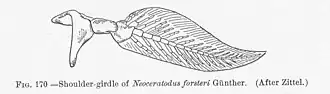 The "fins" of Tiktaalik have helped to contextualize the origin of weight-bearing limbs and digits. The fin has both a robust internal skeleton, like tetrapods, surrounded by a web of simple bony fin rays (lepidotrichia), like fish.[1] The lepidotrichia are thickest and most extensive on the front edge and upper side of the fin, leaving more room for muscle and skin on the underside of the fin.[2] The pectoral fin was clearly weight bearing, being attached to a massive shoulder girdle with expanded scapular and coracoid elements attached to the body armor. Moreover, there are large muscle scars on the underside of the forefin bones, and the distal joints of the wrist are highly mobile. Together, these suggest that the fin was both muscular and had the ability to flex like a wrist joint. These wrist-like features would have helped anchor the creature to the bottom in a fast current.[8][10]