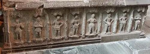 The altar (or "chest") tomb contains 22 pleurants (or "weepers", that is, sculpted figures representing mourners) dressed in armour; eight on each long side and three at each end. These figures are positioned under three-arch canopies and separated by small buttresses.[9]