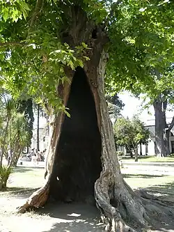 The Imperial Gate is the main entrance into the First Courtyard.[25] The sultan would enter the palace through the Imperial Gate (Turkish: Bâb-ı Hümâyûn, meaning 'royal gate' in Persian, or Saltanat Kapısı) located to the south of the palace.[26] This massive gate, originally dating from 1478, is now covered in 19th-century marble. Its central arch leads to a high-domed passage; gilded Ottoman calligraphy adorns the structure at the top, with verses from the Qur'an and tughras of the sultans. The tughras of Mehmed II and Abdulaziz, who renovated the gate, have been identified.[27]