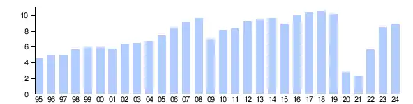 | 2003 | 6,640 | 2011 | 12,496 | 2019 | 14,797 |