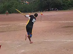 Gudu keliya is a variation of gilli-danda in which one player attempts to knock a small stick on the ground up into the air by hitting it with a longer stick held in the hand, and then tries to hit the small stick as far as possible.[5] Opponents can catch the small stick before it touches the ground to make the hitter lose.[3][2]