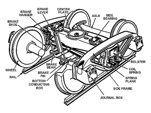 Bogies, also known in North America as trucks, support the wheels and axles of trains. Trucks range from just one axle to as many as four or more. Two-axle bogies are the most common worldwide, as they decrease the impact of track irregularities, improve curve negotiation, and distribute heavy loads more effectively than single-axle bogies.[34]