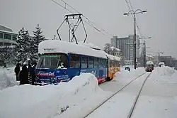 As of 2010, the Sarajevo tram system consists of seven lines,[1][2] running along a single route with a 0.4 kilometres (0.25 mi)-long branch to the city's main railway station (Željeznička Stanica). It primarily serves as an east-west link from the city centre (Baščaršija) to the western suburb of Ilidža.
