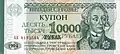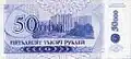 | 50,000 rubles | Blue | Alexander Suvorov overprinted on a 5 ruble note, with a holographic seal containing his equestrian statue in Tiraspol and the value "50000" on front | Transnistrian Supreme Soviet | 1994 | 1996 | |||