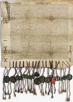 Manuscript charter on two sewn parchment pieces bearing wax seals