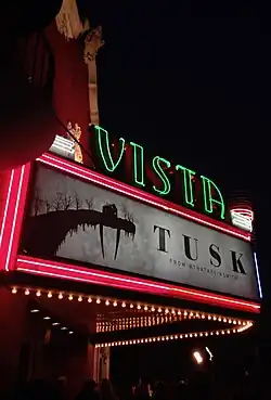 Tusk had its world premiere on September 6, 2014, at the 2014 Toronto International Film Festival, where it was screened as part of Midnight Madness.[19] It was named the first runner-up to the Midnight Madness People's Choice Award.[20] It was screened in Los Angeles at the Vista Theatre on September 16, 2014,[21] before its wide theatrical release on September 19.[22]