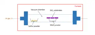 2D semiconductor materials are often synthesized using a chemical vapor deposition (CVD) method. Because CVD can provide large-area, high-quality, and well-controlled layered growth of 2D semiconductor materials, it also allows synthesis of two-dimensional heterojunctions.[17] When building devices by stacking different 2D materials, mechanical exfoliation followed by transferring is often used.[4][6] Other possible synthesis methods include electrochemical deposition,[18][19] chemical exfoliation, hydrothermal synthesis, and thermal decomposition. In 2008 cadmium selenide CdSe quasi 2D platelets were first synthesized by colloidal method with thicknesses of several atomic layers and lateral sizes up to dozens of nanometers.[20] Modification of the procedure allowed to obtain other nanoparticles with different compositions (like CdTe,[21] HgSe,[22] CdSexS1−x alloys,[23] core/shell[24] and core/crown [25] heterostructures) and shapes (as scrolls,[26] nanoribbons,[27] etc.).