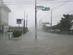 During the storm's passage, there were 61 daily rainfall records broken by Nabi's precipitation across Japan.[2] The rains from Nabi caused significant slope failures and large accumulations of driftwood. The amount of sediment displaced by the rains was estimated at 4,456 m3/km2, over four times the yearly average. A total of 630 m3 (22,000 cu ft) of driftwood was recorded.[57] However, the rainfall also helped to end water restrictions in Kagawa and Tokushima prefectures.[58][59] In addition to the heavy rainfall, Nabi produced gusty winds on the Japan mainland, peaking at 115 km/h (71 mph) in Muroto. A station on Tobishima in the Sea of Japan recorded a gust of 119 km/h (74 mph).[53] The typhoon spawned a F1 tornado in Miyazaki, which damaged several buildings.[60] In Wajima, Ishikawa, Nabi produced a Foehn wind, causing temperatures to rise quickly.[61]