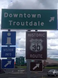 Sections of the highway between The Dalles and Ontario generally follow the route of the Oregon Trail, which was used in the 19th century by U.S. settlers to reach the Willamette Valley.[2] US 30 was created as part of the initial U.S. Numbered Highway System adopted by the American Association of State Highway Officials on November 11, 1926. The number was assigned in place of US 20, which had originally been planned for the corridor in Oregon, after objections from the state government.[3] The new national highway incorporated portions of existing state roads, including the Historic Columbia River Highway, which was constructed between 1913 and 1922 through the Columbia River Gorge.[4][5]
