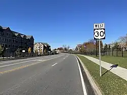 Upon intersecting Old Eagle School Road/Sugartown Road, US 30 enters Delaware County and continues east-southeast along four-lane undivided Lancaster Avenue, curving east and running through the downtown area of Wayne. The route passes through St. Davids and turns southeast. East of here, the road becomes a divided highway before turning undivided again. US 30 briefly becomes a divided highway again as it curves east and reaches an interchange with I-476. Past this interchange, the route turns back into an undivided road and crosses under SEPTA's Norristown High Speed Line before coming to an intersection with PA 320 in Villanova. Following this intersection, the road runs through the Villanova University campus, passing south of St. Thomas of Villanova Church, and curves southeast prior to the Ithan Avenue intersection, where it heads to the south of Villanova Stadium and the Finneran Pavilion arena. After passing through the university campus, US 30 runs through Rosemont. Upon intersecting County Line Road, the route enters Montgomery County and heads into Bryn Mawr, passing through the downtown area. The road continues southeast and briefly reenters Delaware County before heading back into Montgomery County. US 30 passes through Haverford, where it heads north of the Haverford School. The route continues into Ardmore and runs through the downtown area, passing south of the Ardmore station serving Amtrak's Keystone Corridor and SEPTA's Paoli/Thorndale Line. Past Ardmore, the road heads through Wynnewood. The route runs southeast before it crosses the East Branch Indian Creek and passes between the St. Charles Borromeo Seminary to the northeast and Lankenau Medical Center to the southwest as a five-lane road with a center left-turn lane prior to reaching an intersection with US 1 (City Avenue).[2][3]