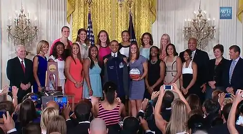 The players, coaches, and other staff of the 2008–09 UConn Huskies, winners of the 2009 national championship, are honored at the White House by President Barack Obama on April 27, 2009.