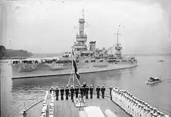 She returned to training cruises in May 1928, when she took a crew of midshipmen into the Atlantic along the east coast, along with a trip down to Cuba.[2] In June, she participated in a joint Army-Navy coast defense exercise as part of the hostile "attacking" fleet.[8] In early 1929, Arkansas cruised in the Caribbean and near the Canal Zone. She returned to the United States in May 1929, for an overhaul in the New York Navy Yard. After emerging from drydock, she conducted another training cruise, this time to European waters; she spent time in the Mediterranean and visited Britain. Arkansas returned to the United States in August and operated with the Scouting Fleet off the east coast. The training cruise for 1930 again went to Europe. She called in Cherbourg, France, Kiel, Germany, Oslo, Norway, and Edinburgh, Scotland. The cruise continued through the end of the year, and in 1931, the battleship visited Copenhagen, Greenock, Scotland, and Cádiz and Gibraltar in Spain. By September, the ship had crossed the Atlantic, and she stopped in Halifax, Nova Scotia.[2] In February, Arkansas participated in Fleet Problem XII.[9] During the maneuvers, she served as Admiral Arthur L. Willard's flagship,[10] and she was "sunk" by a submarine.[11] A month later, on 21–22 March, Arkansas conducted exercises with the carriers Lexington and Saratoga.[12]