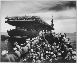 USS Casablanca (AVG/ACV/CVE-55) was the first of fifty Casablanca-class escort carriers built for the United States Navy during World War II. She was named after the Naval Battle of Casablanca, conducted as a part of the wider Operation Torch, which pitted the United States Navy against the remnants of the French Navy controlled by Vichy France. The American victory cleared the way for the seizure of the port of Casablanca as well as the Allied occupation of French Morocco. The ship was launched in April 1943, commissioned in July, and served as a training and transport carrier throughout the war. Postwar, she participated in Operation Magic Carpet, repatriating U.S. servicemen from throughout the Pacific. She was decommissioned in June 1946, when she was mothballed in the Atlantic Reserve Fleet. She was sold for scrap in April 1947.