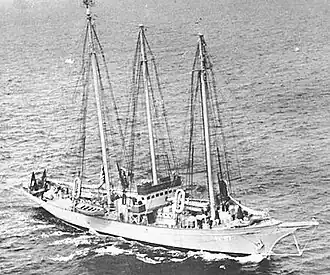 Guinevere was built for Edgar Palmer of New York who specified diesel electric propulsion for what was at the time the largest such yacht built in the United States and the largest fore and aft schooner yacht so far built worldwide.[2] The yacht's power plant consisted of two Winton six-cylinder, 350 hp (260 kW) diesel engines directly connected to Westinghouse generators.[3] The generators provided power to a 555 hp (414 kW) Westinghouse motor directly coupled to the propeller.[4] Design was by A. Loring Swansey with the diesel electric design in cooperation with a Commander Fisher, USN.[2] The yacht was rated for a speed of 11.5 knots (21.3 km/h; 13.2 mph) under engines alone with 11,000 mi (18,000 km) cruising range.[3] A two-ton refrigeration unit, two 15 kilowatt generators, bilge and other pumps, ventilation, power hoists, lights and radio were provided within the electrical system.[2] Batteries provided power at night when the power plant was shut down or in emergencies.[5] Guinevere was built by George Lawley & Son, of Neponset, Massachusetts, and launched 21 April 1921.[3][6][4]