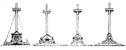 Scaffolding was erected over the stern to facilitate the removal of the mizzenmast (or aft mast) and deck fittings. These items were stored in a hut constructed on one of the cofferdams or aboard the collier USS Leonidas (AD-7).[146] On May 27, 1911, Leonidas transported the mizzenmast back to the United States.[153]