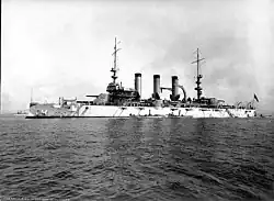 USS Virginia (BB-13) was a United States Navy pre-dreadnought battleship, the lead ship of her class. She was the fifth ship to carry her name. Virginia was laid down in May 1902 at the Newport News Shipbuilding and Dry Dock Company in Newport News, Virginia, was launched in April 1904, and was commissioned into the fleet in May 1906. The ship was armed with an offensive battery of four 12-inch (305 mm) guns and eight 8-inch (203 mm) guns, and she was capable of a top speed of 19 knots (35 km/h; 22 mph).