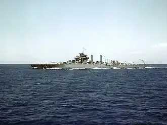 The landing on Leyte led to the activation of Operation Shō-Gō 1, the Japanese navy's planned riposte to an Allied landing in the Philippines.[21] The plan was a complicated operation with three separate fleets: the Northern Force under Vice Admiral Jisaburō Ozawa, the Center Force under Vice Admiral Takeo Kurita, and the Southern Force under Vice Admiral Shōji Nishimura. Ozawa's carriers, by now depleted of most of their aircraft, were to serve as a decoy for Kurita's and Nishimura's battleships, which were to use the distraction to attack the invasion fleet directly.[22] Kurita's ships were detected in the San Bernardino Strait on 24 October 1944, and in the ensuing Battle of the Sibuyan Sea, American carrier aircraft sank the powerful battleship Musashi, causing Kurita to temporarily reverse course. This convinced Admiral William F. Halsey, the commander of Third Fleet, to send the fast carrier task force to destroy the Northern Force, which had by then been detected.[22] While these maneuvers were occurring, Nishumura's force approached the Surigao Strait to attack the invasion fleet from the south. His fleet consisted of the battleships Yamashiro and Fusō, the heavy cruiser Mogami, and four destroyers, supplemented by Vice Admiral Kiyohide Shima's Second Striking Force, consisting of the heavy cruisers Nachi and Ashigara, the light cruiser Abukuma, and four more destroyers.[23]
