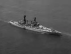 In the early 1930s, the ship underwent a minor modification. Her battery of 3-inch anti-aircraft guns were replaced with 5-inch /25 cal. guns and .50-caliber machine guns were installed on her fore and main masts. She also received aircraft catapults on her quarterdeck and atop the rear superfiring turret.[4] During Fleet Problem XIV in February 1933, West Virginia and the battleship Arizona were "damaged" in a surprise attack by "black" fleet submarines.[6] Plans to modernize West Virginia dated to the mid-1930s, when the navy considered modifying the ship extensively; the Bureau of Construction and Repair planned to add anti-torpedo bulges that would have restored a considerable amount of buoyancy to the hull, raising her 20 in (510 mm) at the cost of an additional 2,000 long tons (2,032 t) displacement. The work was not carried out, and in 1937 further plans to modernize West Virginia, her sister ships, and the two Tennessee-class ships, were considered. The proposed modifications included new boilers and fire control equipment and the previously suggested bulges. Further development of the modernization program in 1938 was rejected due to its cost and the fact that, even as modernized, the vessels would be inferior to the new North Carolina and South Dakota-class battleships being built.[7]