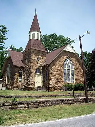 The United Presbyterian Church of Canehill is a historic church on Main Street in Canehill, Arkansas. Built in 1891, it is the only surviving church building in the small community. It is a brick structure with a cruciform plan with steeply pitched gable roofs, large Gothic-arched stained glass windows, and a tower with an octagonal belfry topped by a shingled steeple. Canehill was originally settled in 1828 by a Presbyterian group, and eventually supported three separate Presbyterian congregations over the course of the 19th century. These congregations were reunited into this building in 1905.[2]